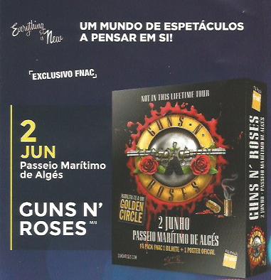 Os bilhetes para o grande concerto dos Guns N'Roses no nosso país no dia 02 de Junho deste ano no Passeio Marítimo de Algés, estão a ser comercializados pela FNAC em 2 formatos: ingresso normal e caixa. Esta 2ª modalidade é um pacote para fãs, designado como "Fan Pack" e para além do bilhete, inclui ainda um póster oficial, sendo que o cliente fica habilitado a ganhar um lugar no chamado Golden Circle. Este é um exclusivo FNAC. Em relação ao preço, é o mesmo de um bilhete normal, €69,00 + €1,00 de comissão, ou seja, €70,00. Mais vale optar pelo pacote de fã...