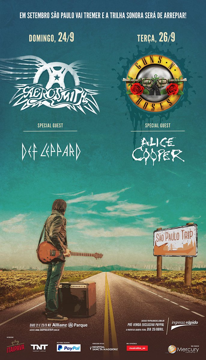 26 de Setembro, esta é a data em que os Guns N'Roses vão actuar no Festival São Paulo Trip, em São Paulo, Brasil. E com um convidado muito especial: Alice Cooper. Isto acontece 3 dias depois do concerto no Rock in Rio, a 23. O evento terá lugar no Allianz Parque. Este Festival vai decorrer em 4 dias: 21, 23, 24 e 26 de Setembro, 5ª feira, Sábado, Domingo e 3ª Feira, respectivamente. Das 8 bandas convidadas, todas estarão também presentes no Rock in Rio, à excepção dos The Cult. A venda prévia dos bilhetes para utilizadores do Paypal, o serviço de pagamento em rede, começou no passado dia 26 de Abril, através do site Ingresso Rápido, sendo que as vendas para o público em geral começaram ontem, por volta das 10 da manhã e através do mesmo site.